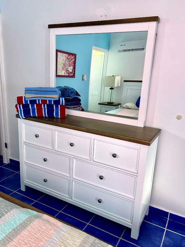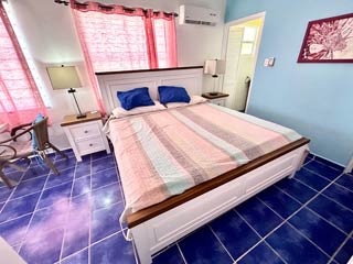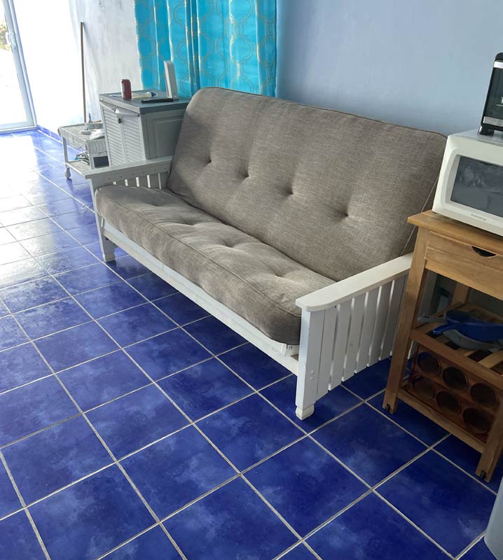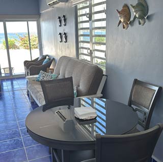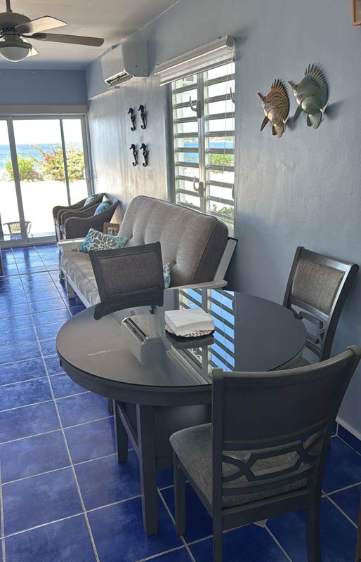 Our most recent updates include a major renovation to enclose our patio allowing for enjoyment of viewing all the marine activity on the Caribbean Sea without having to be annoyed with bug bites or the heat. Brand new bedroom furniture has been purchased with a King orthopedic mattress, side tables, lamps and a dresser. The bathroom upstairs has a water heater and custom cabinets made by a local artisan. There is a digital safe in the closet. Over the upstairs balconey is a custom metal sunshade along with patio lounge furniture. The lower level living space offers a somewhat smaller toilet area and shower and a fully equipped kitchen with refrigerator, microwave, cooktop, coffee maker, blender and toaster oven. The living area has a comfortable fold out futon, a trundle bed, a round table with chairs for breakfast and flat-screen smart tv with connections for Netflix, Youtube, etc. The wifi is fairly fast for connection and download speed.
